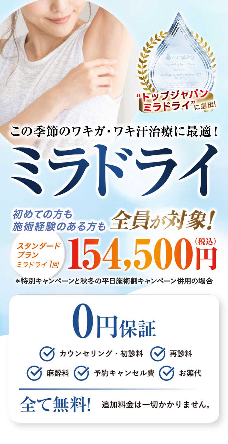 ミラドライの施術予約をお取り頂いた後にキャンセルを希望される場合、施術予約金として頂戴していた20,000円をキャンセル料としてお支払いいただきますので、ご了承ください。