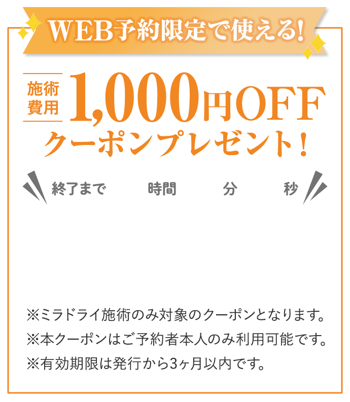 ミラドライ治療の場合、施術前の麻酔やお着替えがありますため、施術開始時間の1時間前のご来院をお願いしております。